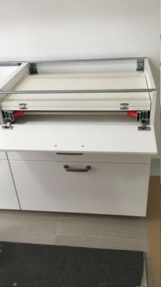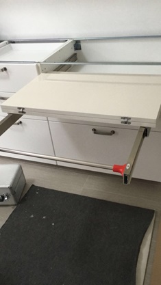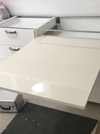 LUNCH pull-out drawer table system adds a peninsula table to any kitchen. It can be easily extracted by simply opening the hinged doors of the compartment. This is the perfect table for a simple breakfast for two to three people or the solution to having a retractable worktop for food preparation.
