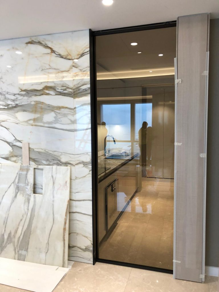 Designed with inspiration from frames used for mirrors, the stable profile construction of system S1200 allows for door widths of up to 1800mm and heights of up to 3500mm. Available in elegant dark bronze finish and matt black powder coating, the narrow edging profile acts as a discreet frame to showcase the infill panels.